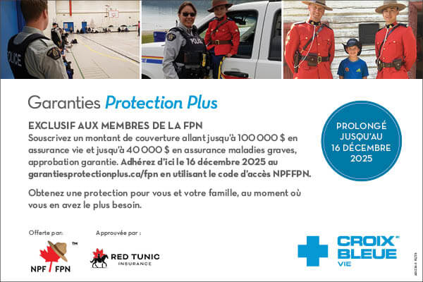 La date limite pour l’offre d’assurance de la Croix Bleue aux membres de la FPN et de leur famille a été reportée au 16 décembre. Cette offre comprend une prestation forfaitaire non imposable si vous ou un membre de votre famille admissible recevez un diagnostic de maladie grave, comme un cancer, une crise cardiaque ou un accident vasculaire cérébral, ou une prestation d’assurance vie garantie d’au moins 100 000 $. Elle est conçue pour vous aider à vous concentrer sur le rétablissement et non sur les difficultés financières, en couvrant les coûts, comme la perte de revenu, les traitements, les déplacements ou les dépenses de ménage. Les participants peuvent demander une couverture sans questionnaire médical pour les minimums garantis. N’attendez pas – rendez-vous au www.protectionplusbenefits.ca/npf dès aujourd’hui pour obtenir votre couverture en utilisant le code suivant : NPFFPN.