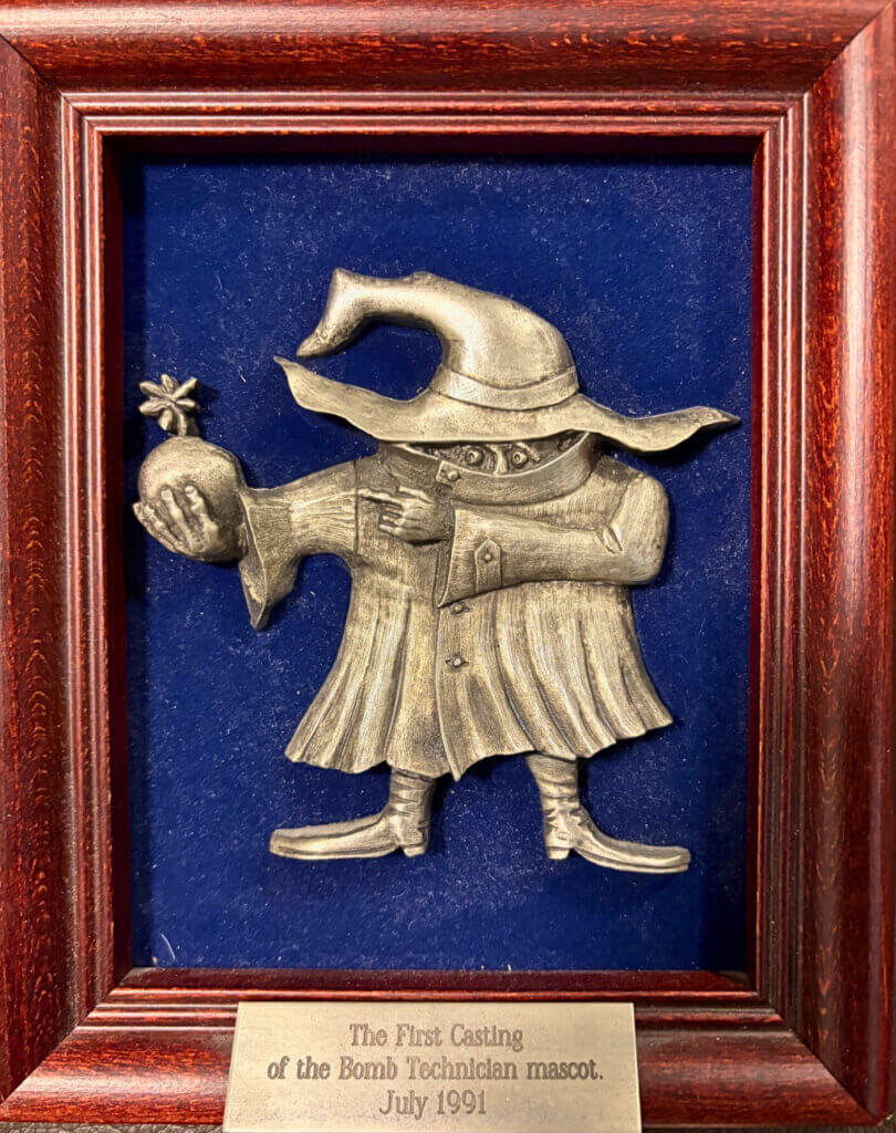 Cette plaque en étain a été conçue par E. Kew de Borden, en Ontario, et représente la mascotte officiellement enregistrée de tous les techniciens en neutralisation des explosifs de la police et des forces militaires canadiennes, protégée par droit d’auteur depuis 1982. Chaque plaque était numérotée individuellement et consignée par le Centre canadien de données sur les explosifs. La mascotte s’inspire de Guy Fawkes, dont le « complot des poudres » de 1605 en a fait l’un des premiers criminels connus à avoir utilisé des explosifs dans l’histoire.