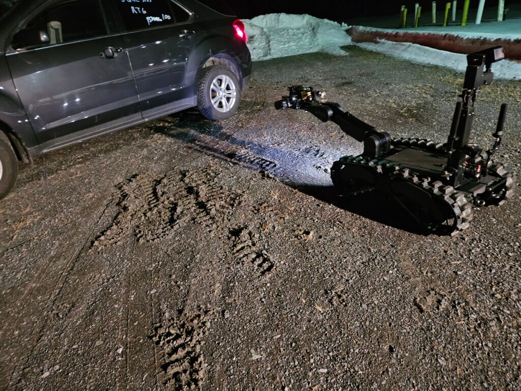 Un robot moderne s’approchant d’un véhicule susceptible de contenir des explosifs. Il est commandé à distance par un membre de les GEE qui se trouve à une distance de sécurité.