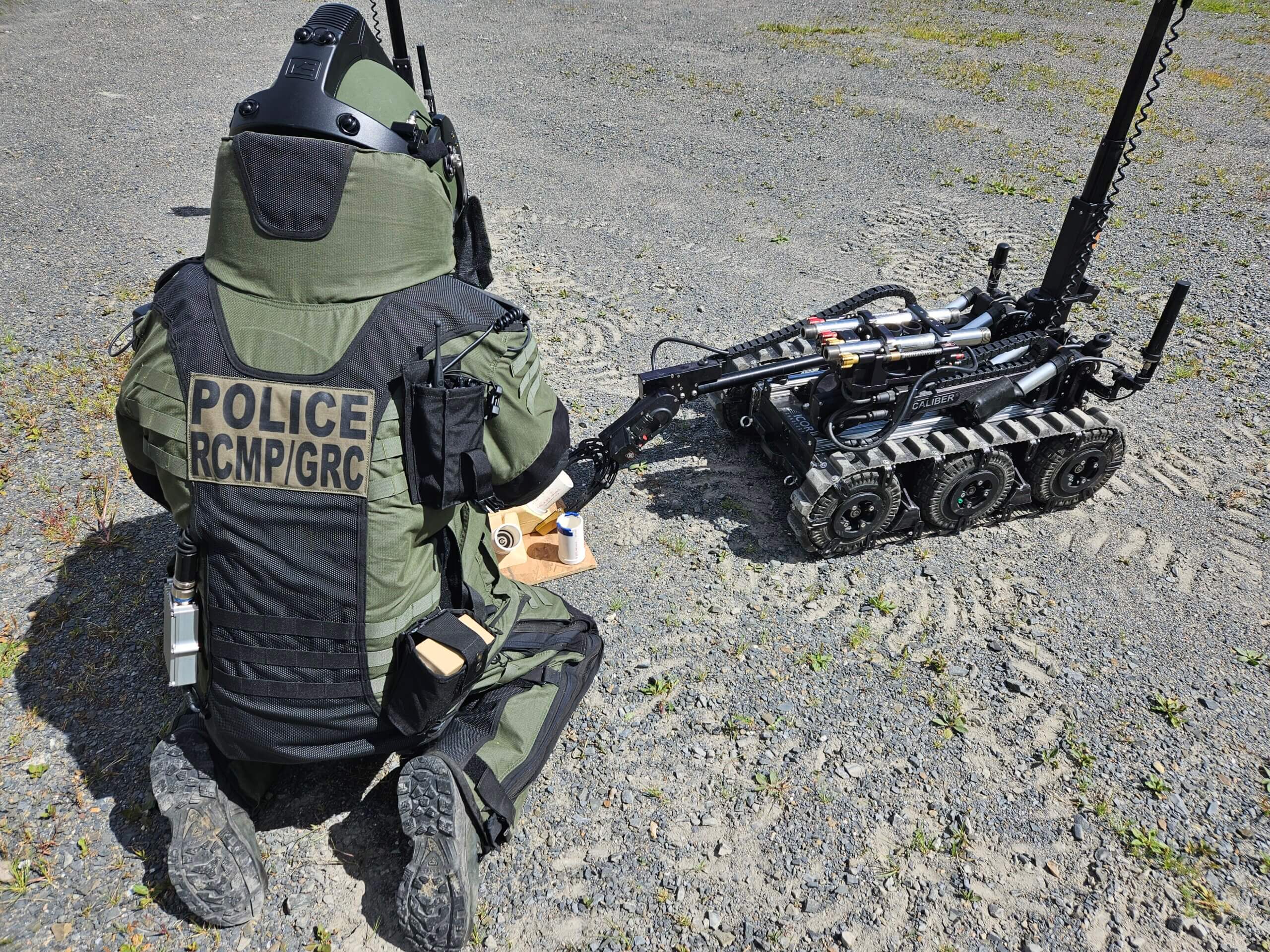 An RCMP Member from the EDU using a robot and wearing the Med-Eng EOD 10E Suit manufactured in Pembroke, Ontario.