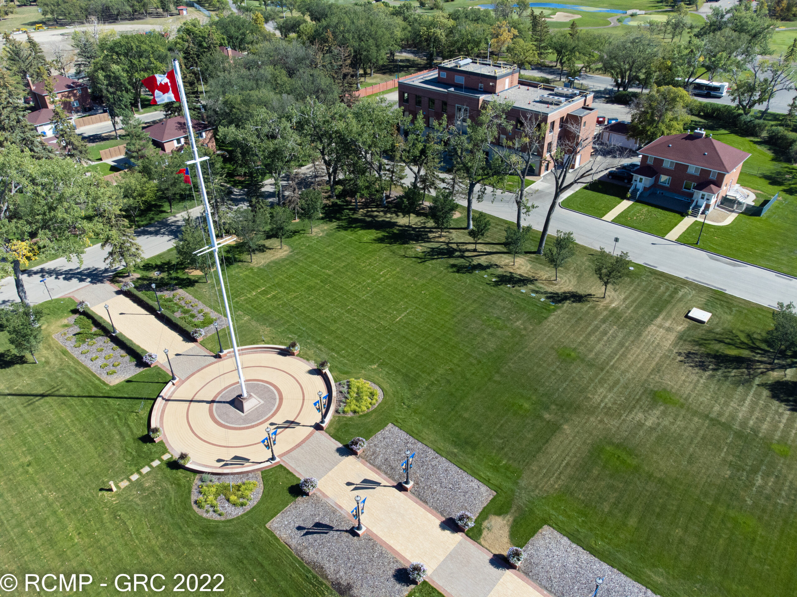 Image of Depot, the RCMP's training facility grounds, with a large flag pole in the middle, surrounded by grass and various buildings.